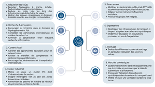 La stratégie 2021 identifie huit actions prioritaires pour accélérer le développement de l'écosystème de l'hydrogène vert au Maroc :